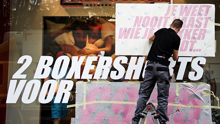 deco textieldoeken geprint, welke in speciale frames in de etalages werden gemonteerd. Op de ramen van de winkel zijn snijteksten geplakt en in de winkel zelf werden